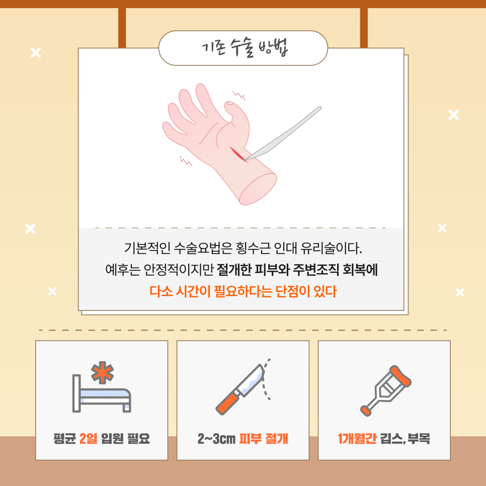 따라서 중기 이상에서는 정중신경을 압박하는 횡수근인대를 유리해 주는 수술적 치료가 필요합니다.