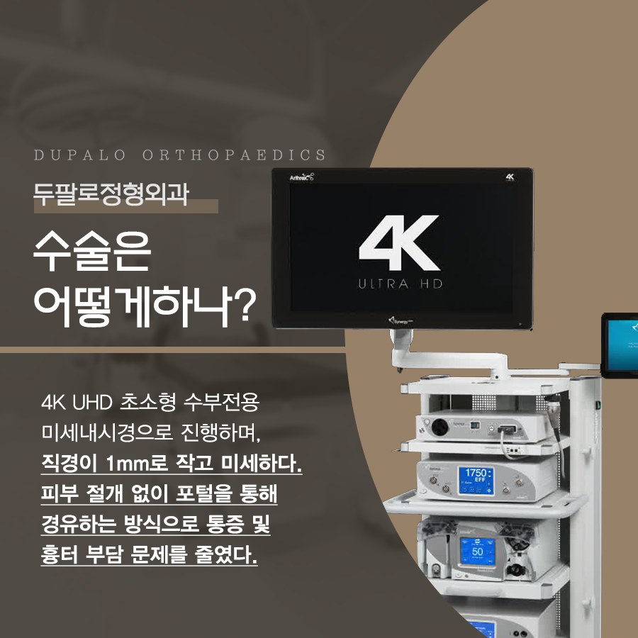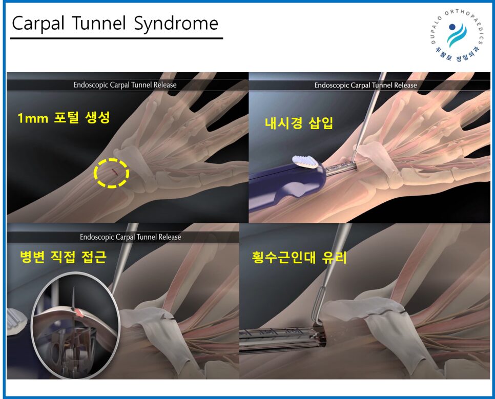 두팔로정형외과에서는 1mm 직경의 초소형 손목내시경을 이용한 횡수근인대 유리술을 시행합니다.