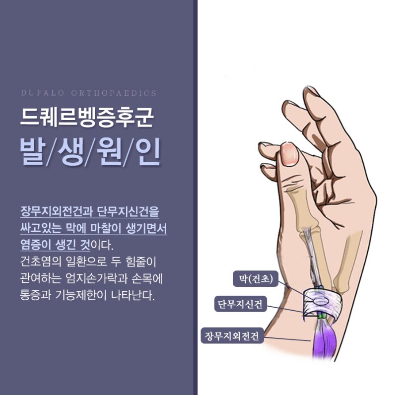 드퀘르벵(De Quervain) 건초염은 손목에서 엄지손가락으로 이어지는 두 개의 힘줄을 감싸고 있는 건초(힘줄막)에 염증이 생기는 질환입니다.